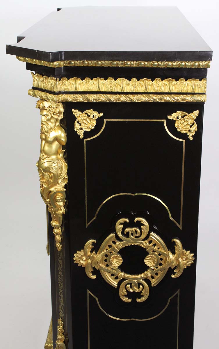 A Fine French Napoleon III Ebonized, Gilt-Bronze Mounted and Tortoiseshell Meuble à Hauteur d'Appui in the Manner of André Charles Boulle (French, 1642-1732) with a Fitted Black Marble Top, by Mathieu Befort, dit Befort Jeune. The ormolu stamped "BEFORT". Circa: Paris, 1870-80.