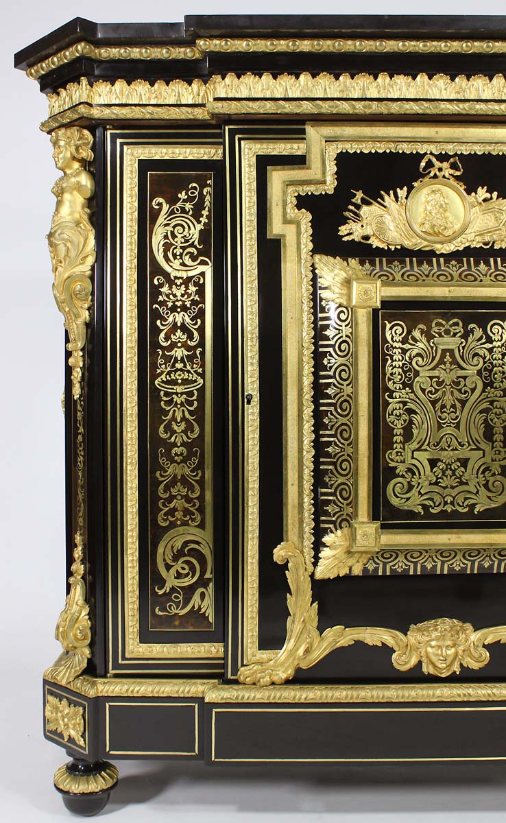 A Fine French Napoleon III Ebonized, Gilt-Bronze Mounted and Tortoiseshell Meuble à Hauteur d'Appui in the Manner of André Charles Boulle (French, 1642-1732) with a Fitted Black Marble Top, by Mathieu Befort, dit Befort Jeune. The ormolu stamped "BEFORT". Circa: Paris, 1870-80.
