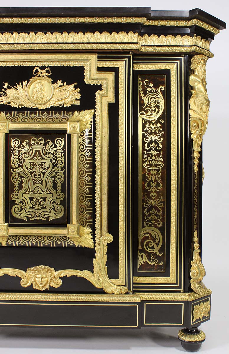 A Fine French Napoleon III Ebonized, Gilt-Bronze Mounted and Tortoiseshell Meuble à Hauteur d'Appui in the Manner of André Charles Boulle (French, 1642-1732) with a Fitted Black Marble Top, by Mathieu Befort, dit Befort Jeune. The ormolu stamped "BEFORT". Circa: Paris, 1870-80.