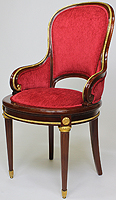 A Very Fine Set of Twelve French 19th-20th Century Louis XVI Style Belle Époque Mahogany and Ormolu Mounted Dining Chairs. The rounded and padded backrests and sides, surmounted with a banded gilt-bronze trim and medallions, raised on fluted legs with acanthus sabots.The frames stamped "FL", attributed to François Linke. Circa: Paris, 1900.