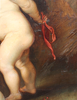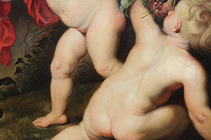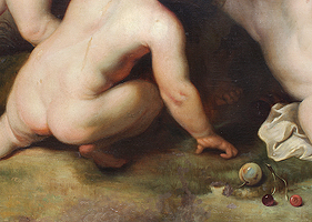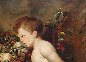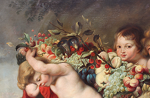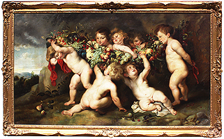 Follower of Frans Snyders (Dutch, 1579-1657) and Sir Peter Paul Rubens (Dutch, 1577-1640) A Very Large and Impressive Allegorical Oil on Canvas "Putti Carrying a Garland of Fruit in a Landscape " (Der Früchtekranz) depicting seven allegorical playful putti (children) carrying a garland of fruits and flowers, an embodiment's of felicia tempora, hope for a happy future, this is an early 20th century copy of the original painting currently part of the collection at The Alte Pinakothek in Munich, Germany. Signed, inscribed and dated 'n. Rubens / V.A. Huff München 05' (lower left). Circa: Munich, 1905.