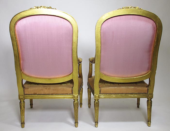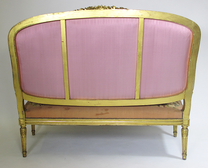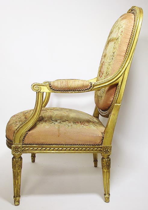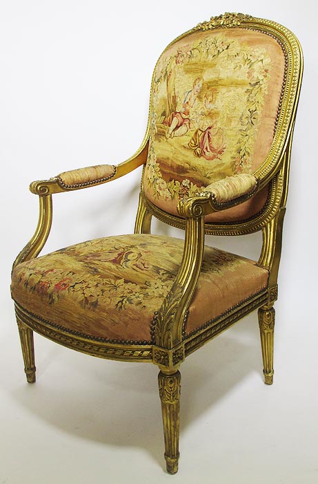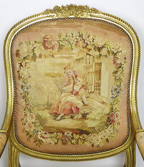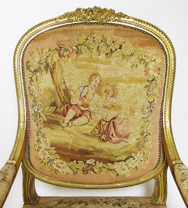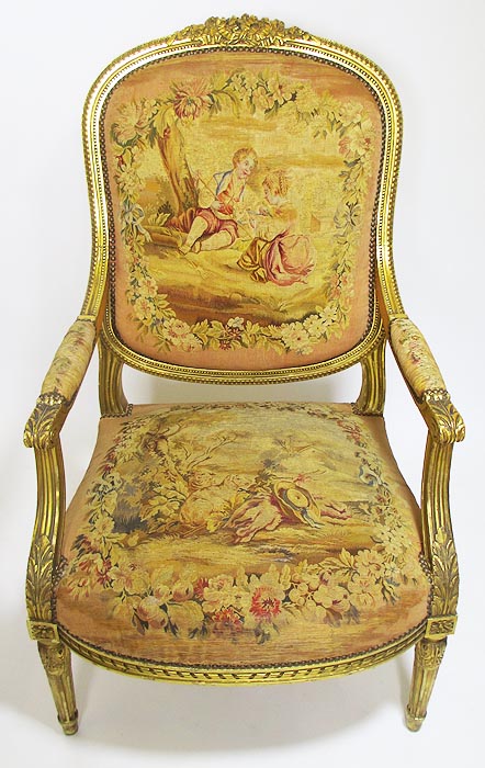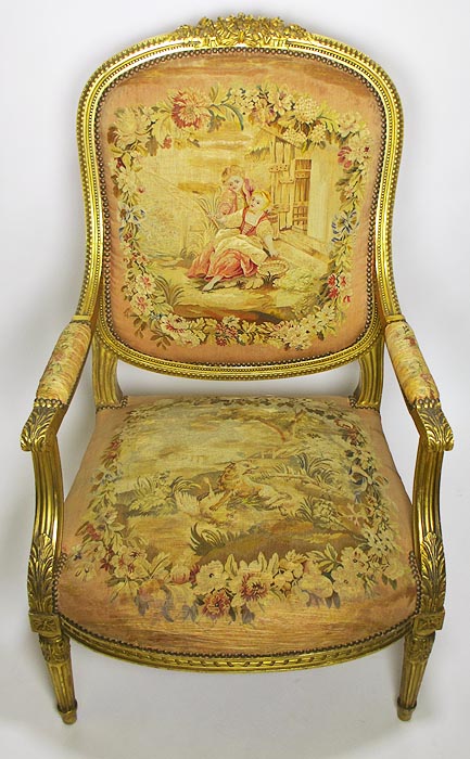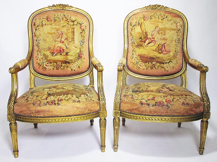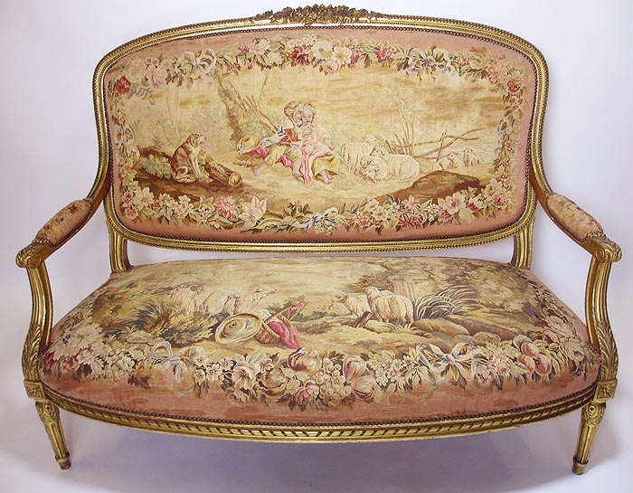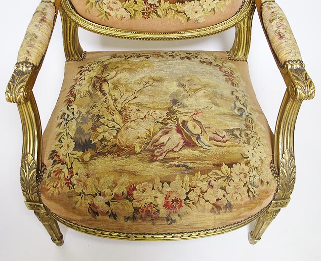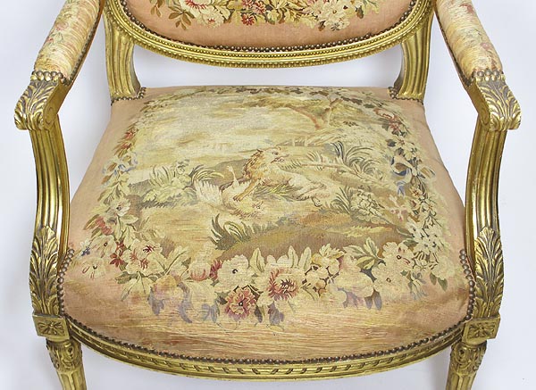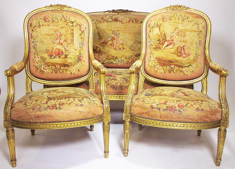 A Fine French 19th Century Louis XVI Style Gilt-Wood and Aubusson Silk-Tapestry Three Piece Salon Suite, comprising of a Canapé and a pair of Fauteuils a la Reine. Circa: 1870.