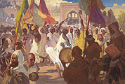 This artwork resembles in many ways the style, colors and features of a large painting by the renowned Austrian artist Ludwig Deutsch (Vienna, 1855-1935) titled "The Procession of the Mahmal Through the Streets of Cairo" which was offered at Sotheby's London, The Orientalist Sale, on April 8, 2014, Lot 7. Click here to view