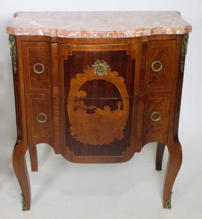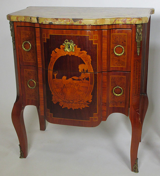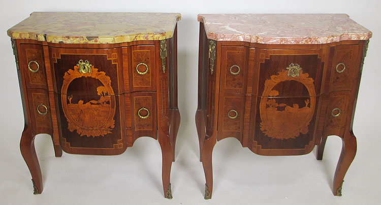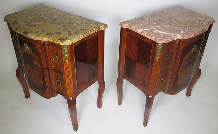 A Pair of French 19th/20th Century Louis XI Style Mahogany and Fruitwood Marquetry Two-Drawer Mini-Commodes - Night Tables. The marble tops are different, one with a Breche d'alep and the other with a Rouge Royal marble. The marquetry decpicting a galloping horse. Circa: 1900.
