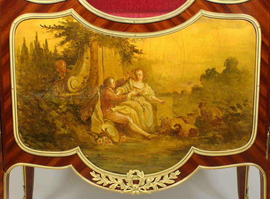A Very Fine French Belle Époque 19th Century Tulipwood and Gilt-bronze Mounted Vernis Martin Decorated Vitrine by Louis Majorelle (French, 1859-1926). The single door case with a hand painted board depicting a garden courting scene surmounted with ormolu wreaths and a banded frame. The top with a pierced gilt-bronze gallery above an ormolu royal tassel trim flanked by a pair of female masks above crossed torches and flames, cross flutes, a tambourine, a pan flute, ribbons and a tassel. Raised of four cabriolet legs with corner ormolu wreaths and leaves ending with hooves. Circa: Paris, 1990.