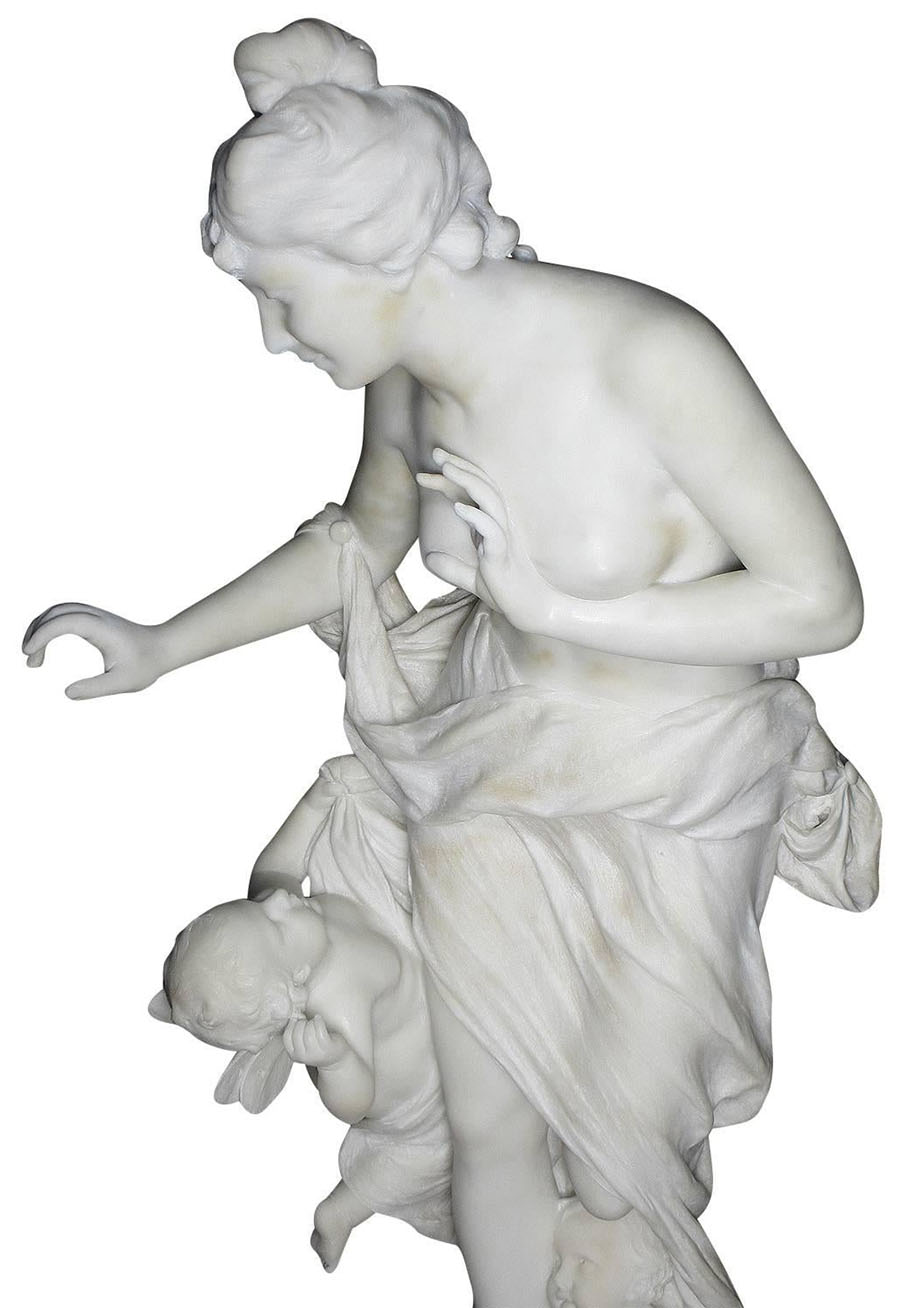 A Very Fine Museum Quality Italian 19th Century Life-Size Carrara Marble Figure of "Searching for Love" by Vito Pardo (Italian, born in Venice in 1872) Depicting a semi-nude life-size maiden surmounted with a cherub at her side and a putto at her feet, all raised on a venigrated yellow and beige solid marble pedestal with gilt-bronze mounts. Signed: Vito Pardo, Roma. Circa: 1890-1900.