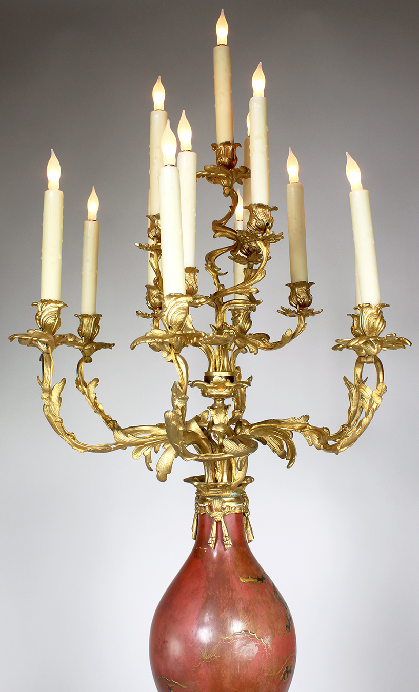 A Fine Pair of 19th Century Japanese Imari Porcelain and French Gilt-Bronze Mounted Thirteen-Light Celadon Torchere Candelabra. The bottle-shaped vase with a Royal red background, decorated with parcel-gilt and black soaring eagles in the hunt within a forestall scene. Each Vase fitted and surmounted with a French 19th century Louis XV Style 13-Light scrolled candelabrum and all raised on a circular pierced gilt-bronze plinth. Circa: 1880.