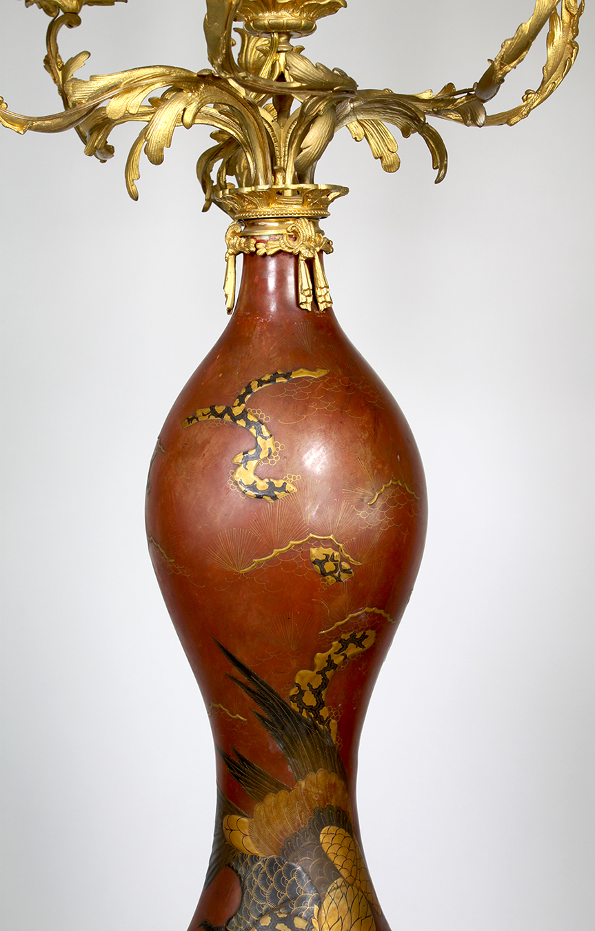 A Fine Pair of 19th Century Japanese Imari Porcelain and French Gilt-Bronze Mounted Thirteen-Light Celadon Torchere Candelabra. The bottle-shaped vase with a Royal red background, decorated with parcel-gilt and black soaring eagles in the hunt within a forestall scene. Each Vase fitted and surmounted with a French 19th century Louis XV Style 13-Light scrolled candelabrum and all raised on a circular pierced gilt-bronze plinth. Circa: 1880.