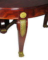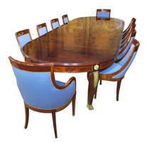 A Very Fine French 19th/20th Century Empire Style Sixteen Piece Exotic Mahogany Marquetry and Gilt-Bronze Mounted Dining Suite, comprising of a table with five extensions, ten chairs and two armchairs, a buffet server with a green d'alps marble top and a pair of wall mounting demi-lune consoles with similar marble top. Circa: Paris, 1890-1900.