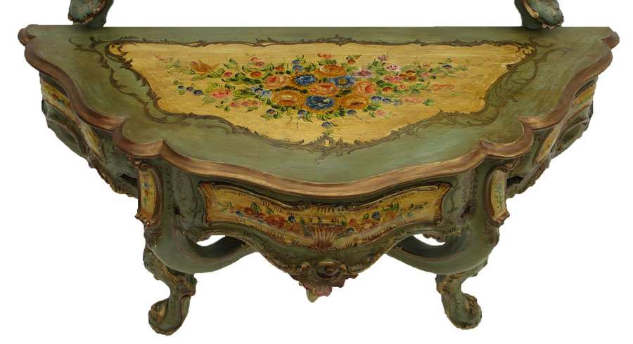 A Rare Italian 19th/20th Century Polychrome-Painted and Floral Decorated Carved Wood Console and Mirror, the serpentine bombé form console decorated with parcel-gilt and colorful floral bouquets over a green and ivory painted background, the front apron with a single drawer, carved with rocaille and scrolls on cabriole legs, the matching mirror with similar carving and painted decoration. Circa: Venice, 1900.