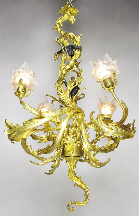 A Fine French Belle Époque Gilt and patinated bronze Figural Four-Light Whimsical Chandelier. The scrolled gilt bronze body with branched arm lights with floral frosted glass shades, the upper stem surmounted with a pair of black-patinated bronze baby mermaids. Circa: Paris, 1900.
