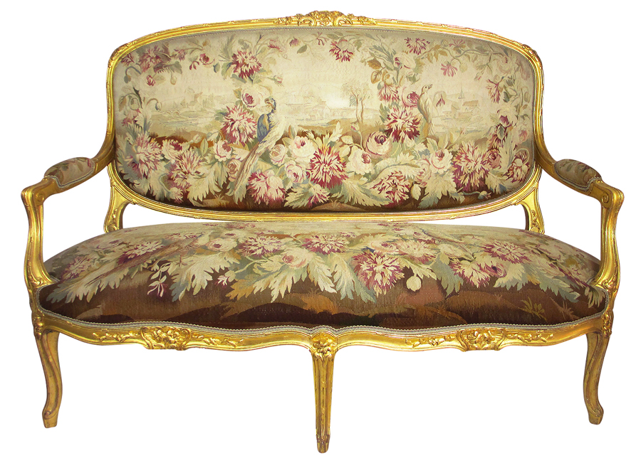 A Very Fine French 19th Century Louis XV Style Three Piece Gilt Wood Carved and Silk Aubusson Tapestry Three Piece Salon Suite, comprising of a settee and two fauteuils (armchairs), the Aubusson silk tapestry with a design of flowers, trees, parrots and pheasants with villages and cottages in the background. The tapestry in excellent original condition, the finely carved frame with its original 24 carat gilt. Circa: Paris, 1880-1890.