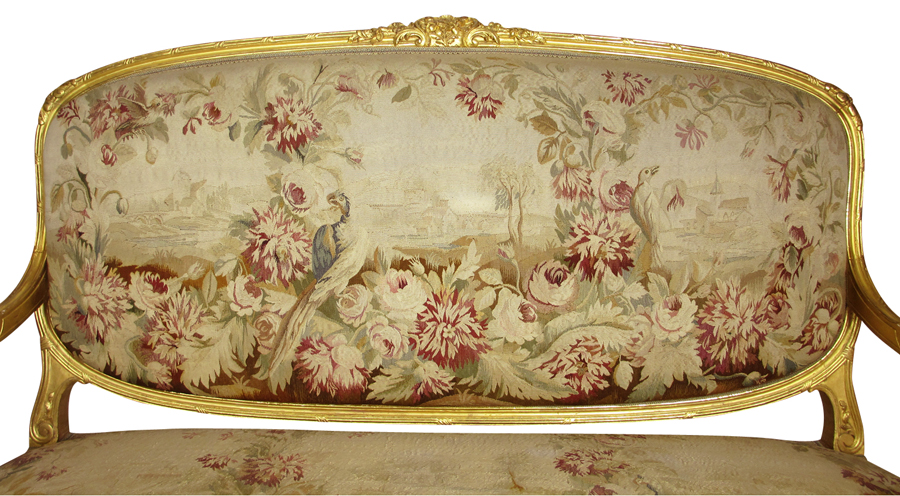 A Very Fine French 19th Century Louis XV Style Three Piece Gilt Wood Carved and Silk Aubusson Tapestry Three Piece Salon Suite, comprising of a settee and two fauteuils (armchairs), the Aubusson silk tapestry with a design of flowers, trees, parrots and pheasants with villages and cottages in the background. The tapestry in excellent original condition, the finely carved frame with its original 24 carat gilt. Circa: Paris, 1880-1890.
