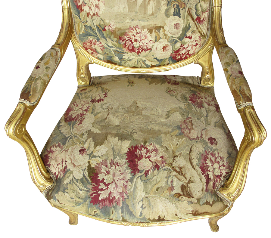 A Very Fine French 19th Century Louis XV Style Three Piece Gilt Wood Carved and Silk Aubusson Tapestry Three Piece Salon Suite, comprising of a settee and two fauteuils (armchairs), the Aubusson silk tapestry with a design of flowers, trees, parrots and pheasants with villages and cottages in the background. The tapestry in excellent original condition, the finely carved frame with its original 24 carat gilt. Circa: Paris, 1880-1890.