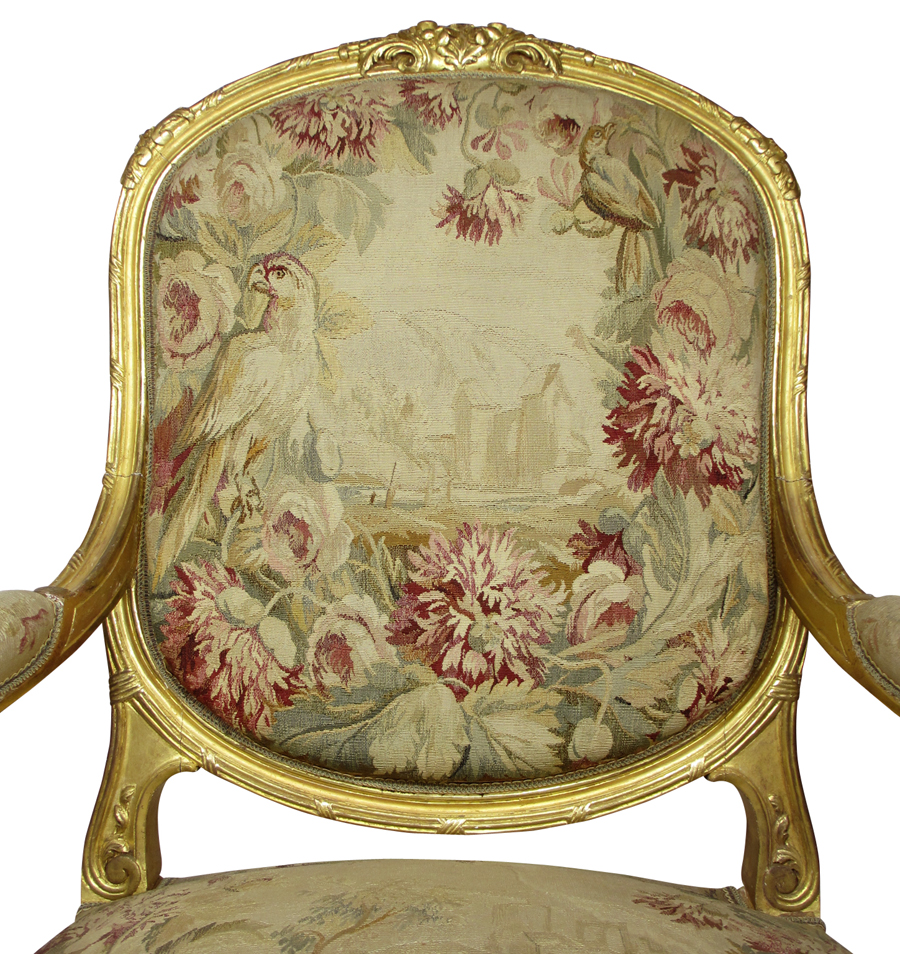 A Very Fine French 19th Century Louis XV Style Three Piece Gilt Wood Carved and Silk Aubusson Tapestry Three Piece Salon Suite, comprising of a settee and two fauteuils (armchairs), the Aubusson silk tapestry with a design of flowers, trees, parrots and pheasants with villages and cottages in the background. The tapestry in excellent original condition, the finely carved frame with its original 24 carat gilt. Circa: Paris, 1880-1890.