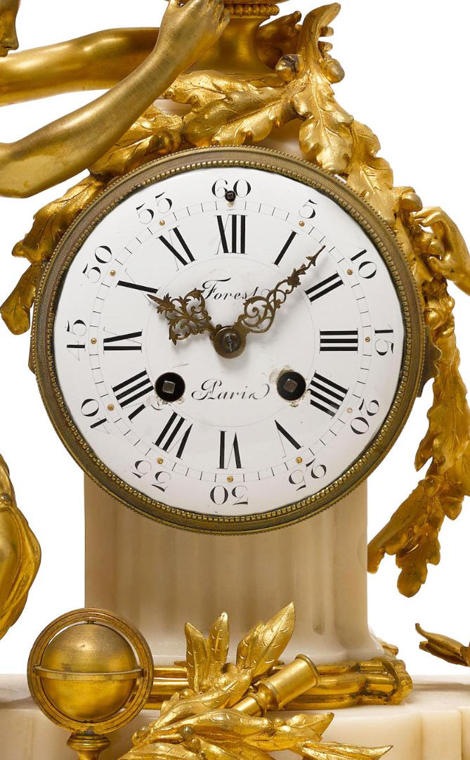 A Very Fine French 19th Century Louis XVI Style Ormolu-Mounted and White Carrara Marble Figural Mantel Clock, by Maison Forest, á Paris; Emblematic of Astronomy, modelled with a young maiden instructing a Cherub holding a sundial; The drum shaped clock case with Roman numerals surmounted by a fluted urn with a central enamel porcelain band inscribed with the signs of the Zodiac. Circa: 1890.