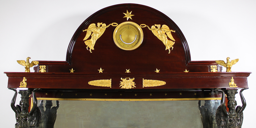 An Impressive Pair of Napoleon III Empire Revival Mahogany, Gilt-Bronze and Patinated-Bronze Mounted Servers, After Pierre-Philippe Thomire (1751–1843), each cabinet surmounted with a pair of winged maidens on mahogany stands mounted with Napoleonic plaques, the frieze centered with a plaque of Medusa flanked by laurels above a green marble top. The splash backing with a framed mirror decorated with gilt-bronze stars. The domed top centered with a circular ormolu thermometer plaque surmounted with a pair of allegorical gilt-bronze winged maidens holding wreaths above a shelf surmounted with a pair of eagles. The lower cabinet with a pair of drawers with swan ormolu handles above a pair of storage doors with winged crowning maidens with trumpets and profiles of the Emperor Napoleon, all raised lion-paw. Circa: 1870.