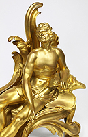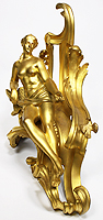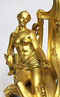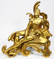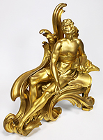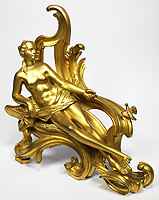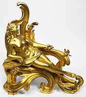 A Fine Pair of French 19th Century Louis XV Style Gilt-Bronze Figural Chenets (Andirons), each depicting a classically draped reclining figure, one male holding a hammer and the other a nude female feeding a bird, both on a scrolled foliate cast base. Stamped: BOUHON FRES. Circa: Paris, 1880.