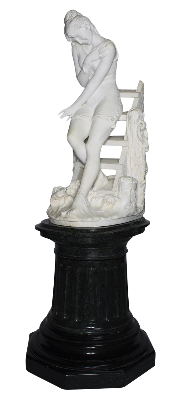 An Extraordinary Fine Italian 19th Century Carrara Marble Sculpture of a Young Beauty Going for a Swim Standing on the Steps of a Dock, raised on a carved green marble pedestal, by Emilio Fiaschi (Italian, 1858-1941). The intricately carved marble figure of the young beauty wearing a laced bathing suit, stepping down from old and damaged dock to test the temperature of the water with her toes embodies a moment in time in the late 19th century when women began wearing more revealing and elegant swimwear. Fiaschi's artful and sensual depiction of the girl's charming pose and delightful smile as she anticipates the joy of going for a swim makes this one of his finest works. Signed: E. Fiaschi . Circa: Florence, 1890.