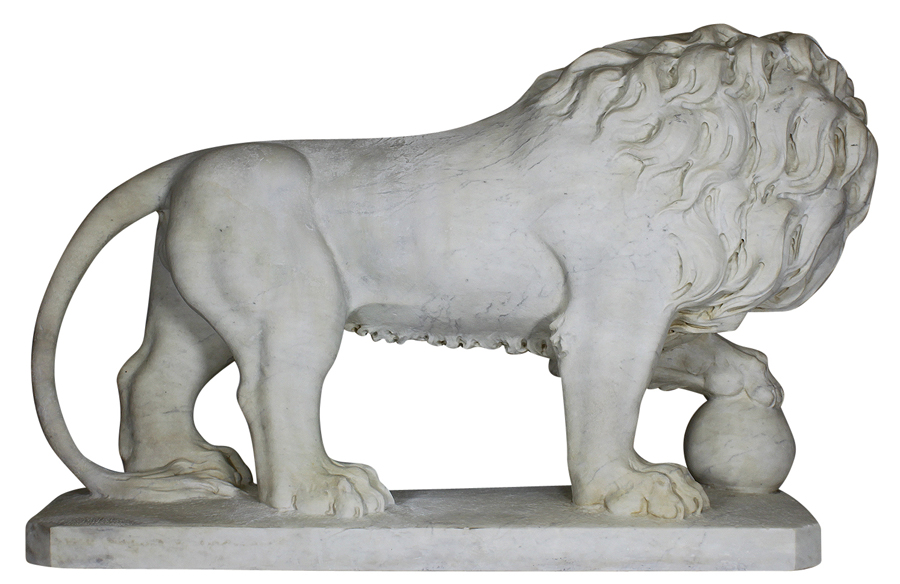 A Palatial Life-Size Pair of Italian 19th Century Finely Carved White Marble Figures of Lion Guards, after a model of the Medici Lions from the Villa Medici in Rome, and since 1789 displayed at the Loggia dei Lanzi, Florence. Each imposing sculpture depicts a standing male lion with a sphere under one raised paw and looking to the side, the finely carved body with detailed carvings of the ribs, veins and fur. Unsigned. Circa: Florence, 1870-1880.