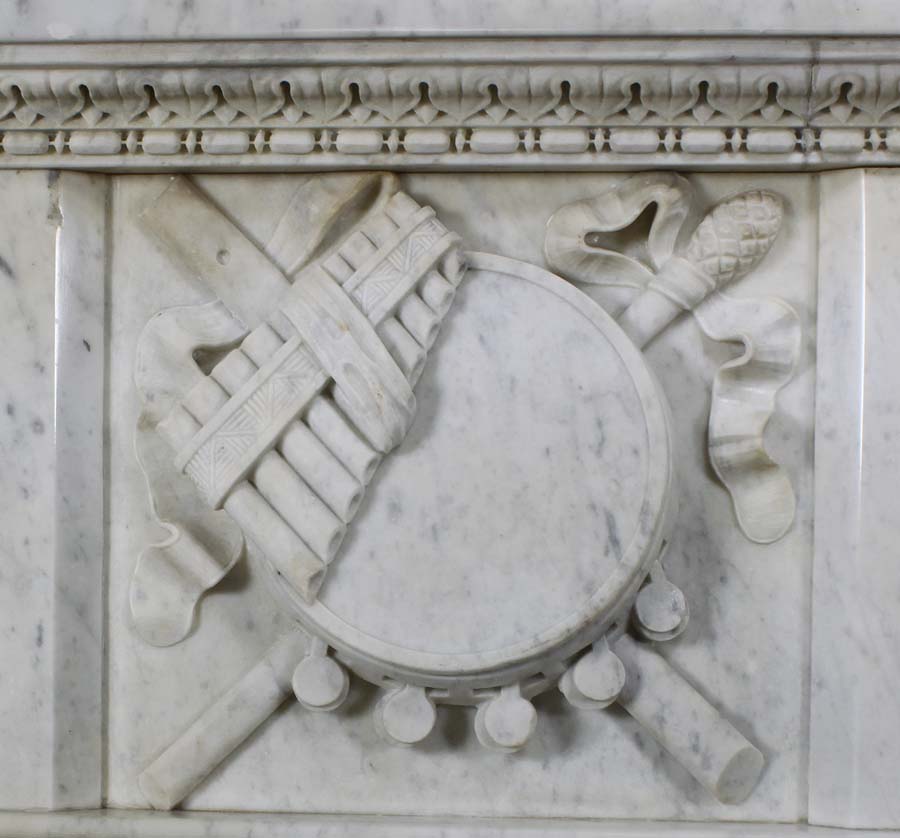 Fine French 19th Century Louis XVI Style Carved White Marble Fireplace Mantel Surround. The apron with carvings of musical instruments and allegorical to abundance with fruits and ribbons within an urn. Circa: Paris, 1880.