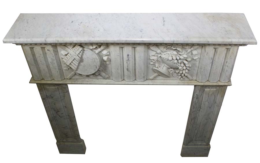 A Fine French 19th Century Louis XVI Style Carved White Marble Fireplace Mantel Surround. The apron with carvings of musical instruments and allegorical to abundance with fruits and ribbons within an urn. Circa: Paris, 1880.