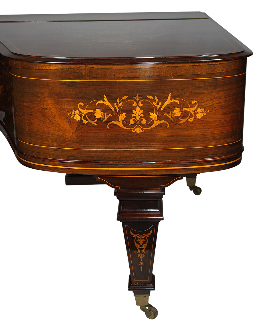 A Very Fine English 19th Century Neoclassical Revival Style Rosewood, Palisander, Amboyna and Satinwood Marquetry Art-Case Baby Grand Piano, the works by "Collard & Collard". The intricately decorated marquetry top, sides and keyboard cover with designs of exotic flowers, floral bouquets and arrangements, acanthus, fruits and leaves, raised on three square legs with gilt-bronze casters. The music board casted with the "Collard & Collard" logo, K-3 and stamped "H. Hinton". The same logo, but in marquetry, under the keyboard cover. Circa 1875-1900.
