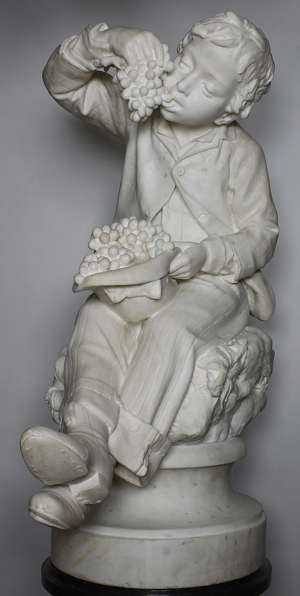 A Very Fine Italian 19th Century Carved Carrara Marble Sculpture Group Titled "LA GIOIA NELL'INNOCENZA DOPO IL LAVORO" (The Joy of Innocence After Labour) by Professor Raffaele Belliazzi (Italian, 1835-1917). The slender figure of the young boy, seated and resting on a rock with his hanging legs crossed and joyfully eating a cluster of grapes picked from his hat that is resting on his lap. The intricate carving of his shirt, jacket, pants, hat and boots with fine attention details such at the stitching, buttons, the hem on his pants, the wear on the soles of his boots and the features on his face makes this one of Belliazzi's finest known works. The sculpure rests on a dark green serpentine marble pedestal with a rotating top. Signed: Profor. Belliazzi, Carrara. Circa: Florence, 1870-1880.