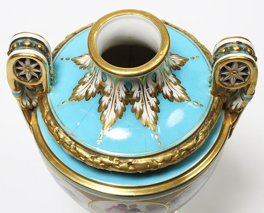 A Fine Pair of English 19th Century Turquoise Ground and Parcel Gilt Painted Porcelain Vases - Urns by Minton. The tapered shaped urns raised on a slender stem with turquoise grounds painted with romantic garden and courting scenes, with gilded wreaths round the shoulders and white glazed foliage picked in gold around the neck, base and handles. Signed: Edouard Rischgitz and stamped underglaze: Minton. Circa: London, 1880.