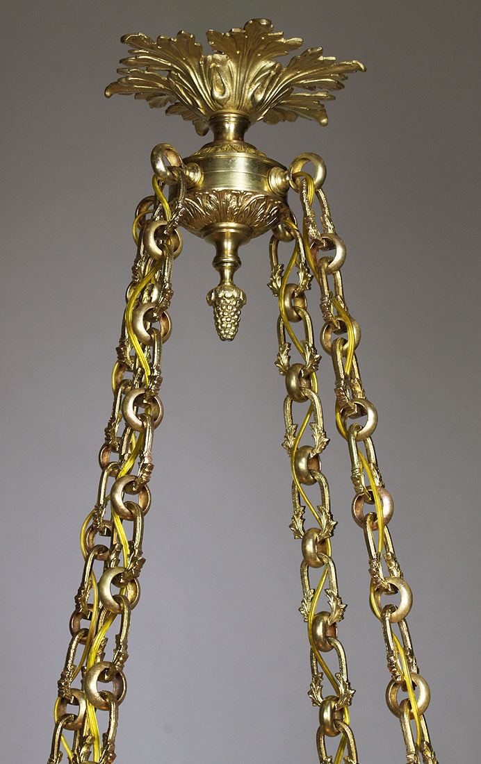 A Fine French Early 20th Century Neoclassical Revival Style Gilt-Bronze, Alabaster and Opaline Glass Four-Light Chandelier. The intricate circular gilt-bronze frame suspended by four ornate gilt-bronze chain strands, the pierced apron decorated with chased gilt-bronze branches and leaves, surmounted with four "S" shaped candle-arms emanating from a floral shield and fitted with carved alabaster shades, all above an ovoid shaped frosted Opaline glass plafonnier ending with an acorn finial. Circa: Paris, 1900.