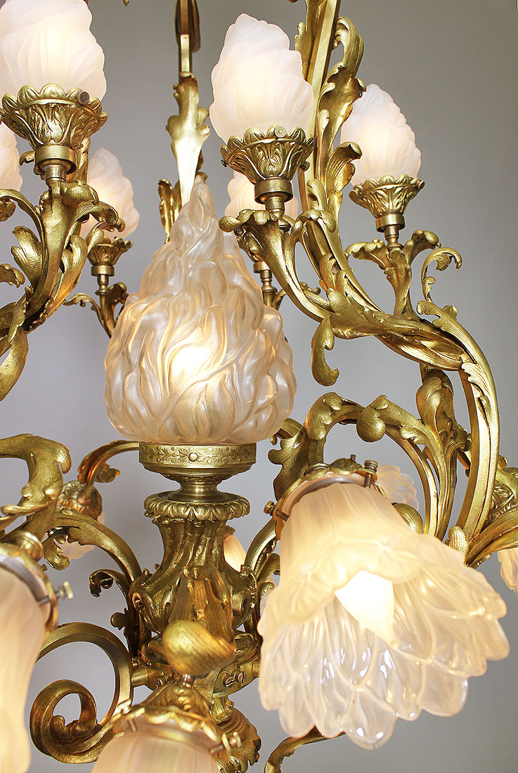 A Fine French Belle Époque Rococo Style Gilt-Bronze and Frosted Glass Shades Nineteen Light Chandelier. The ornate gilt-bronze frame surmounted six upper scrolled candle arms with frosted glass shades in the form of burning flames centered with a larger single flame glass shade, all above the lower twelve scrolled candle arms with frosted glass shades in the form of flowers. Circa: Paris, 1900.