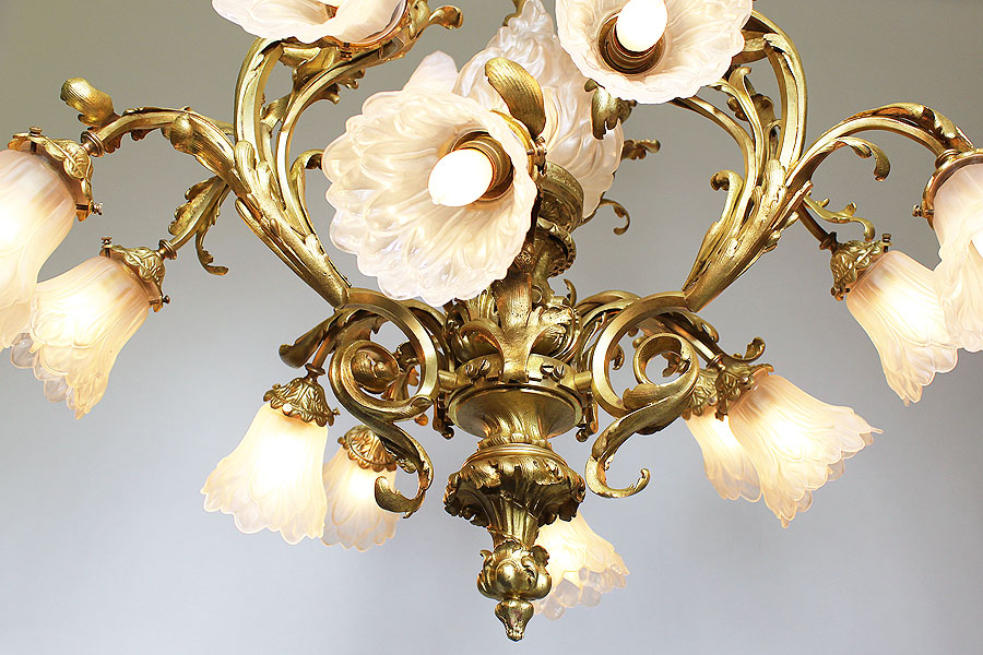 A Fine French Belle Époque Rococo Style Gilt-Bronze and Frosted Glass Shades Nineteen Light Chandelier. The ornate gilt-bronze frame surmounted six upper scrolled candle arms with frosted glass shades in the form of burning flames centered with a larger single flame glass shade, all above the lower twelve scrolled candle arms with frosted glass shades in the form of flowers. Circa: Paris, 1900.