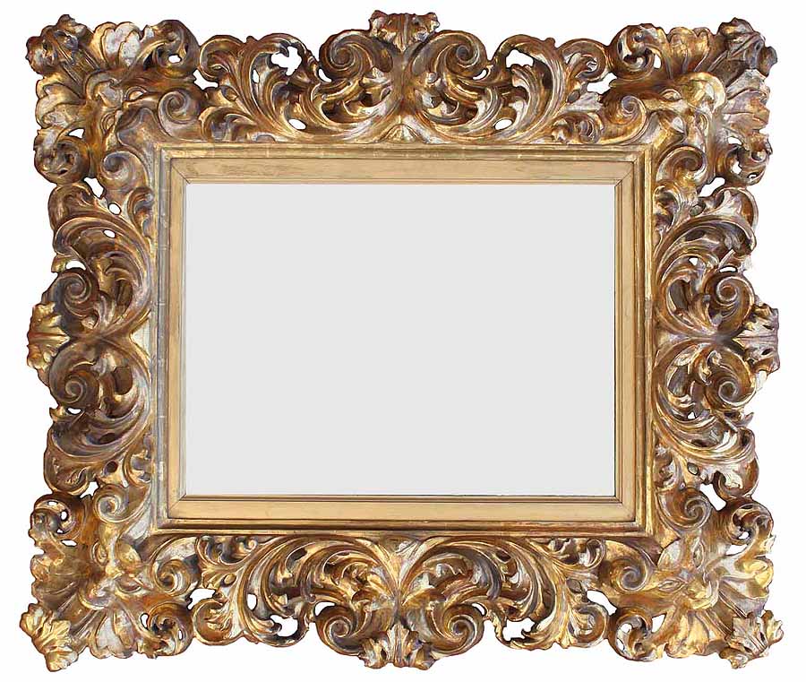 A Fine Italian 19th Century Baroque Style Florentine Gildwood Carved Figural Mirror Frame, with carvings of allegorical masks on each corner. Circa: Florence, 1880.