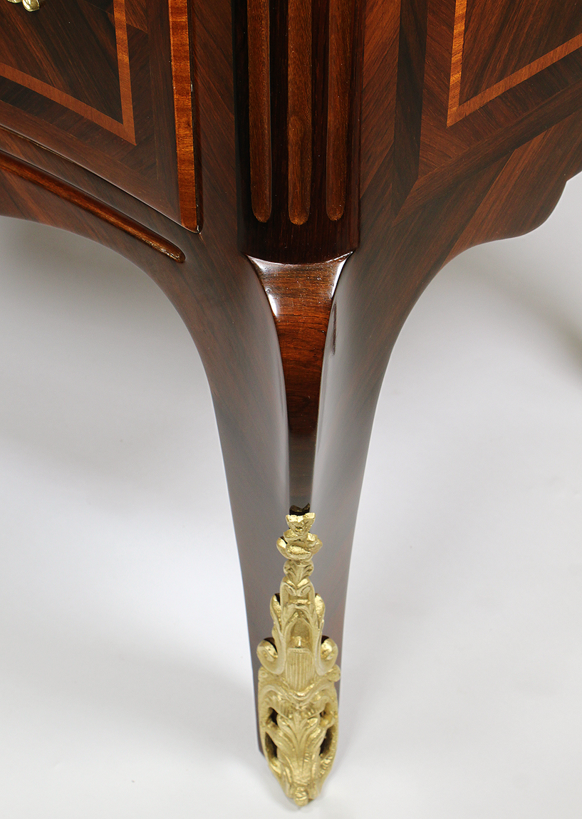 A Fine French 19th Century Régence Style Kingwood and Tulipwood Parquetry and Ormolu Mounted Two-Drawer Commode with Marble Top. Circa: Paris, 1890.