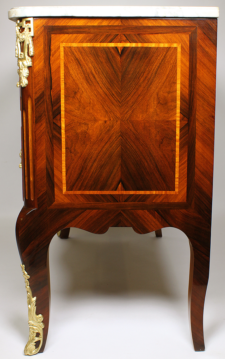A Fine French 19th Century Régence Style Kingwood and Tulipwood Parquetry and Ormolu Mounted Two-Drawer Commode with Marble Top. Circa: Paris, 1890.