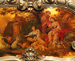 A Fine French 19th/20th Century Louis XV Style Gilt Wood Carved Figural Trumeau Mirror. The elongated frame crowned with a carved floral shell above an allegorical mask of a satyr and centered with an oil on panel painting depicting an outdoor romantic scene of two maidens and a standing young man, sheep, flowers, trees, a lake and park sculptures. The banded and acanthus carved sides ending with scrolled leaves and shrubs and centered with a beveled mirror plate. The back stamped ''Delaunay & Lefevre / Fabricants / de Meubles / 57 Faub & St. Antoine, PARIS''. Circa: Paris, 1900.