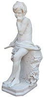 An Italian 19th Century Carved Carrara Marble Figure of a Standing Young Boy with a Mandolin. The standing figure of a young boy with crossed legs, semi-naked with a blanket around his waist, leaning on a rocky outcrop with wild plants at the base and holding on to his mandolin to his right and his left clenched hand by his chin. Signed and Dated: Victor Fucignas - 1897.