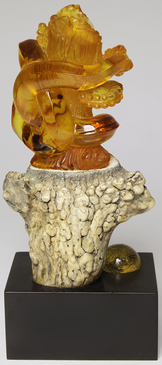 A Finely Carved Natural Aber Specimen Group of Nesting Snakes, featuring a large, very clear amber specimen from Chiapas, Mexico, a carving representing two snakes intertwined around a tree trunk rests within a section of natural moose antler which cleverly represents the base of the tree. A mother-of-pearl carved egg form tops the display. On a jet base with an amber piece giving the impression of an imbedded sphere. Offered with a custom-fitted Balinese fabric covered box. Designed by Lee Downey, Bali, Indonesia. 20th Century.