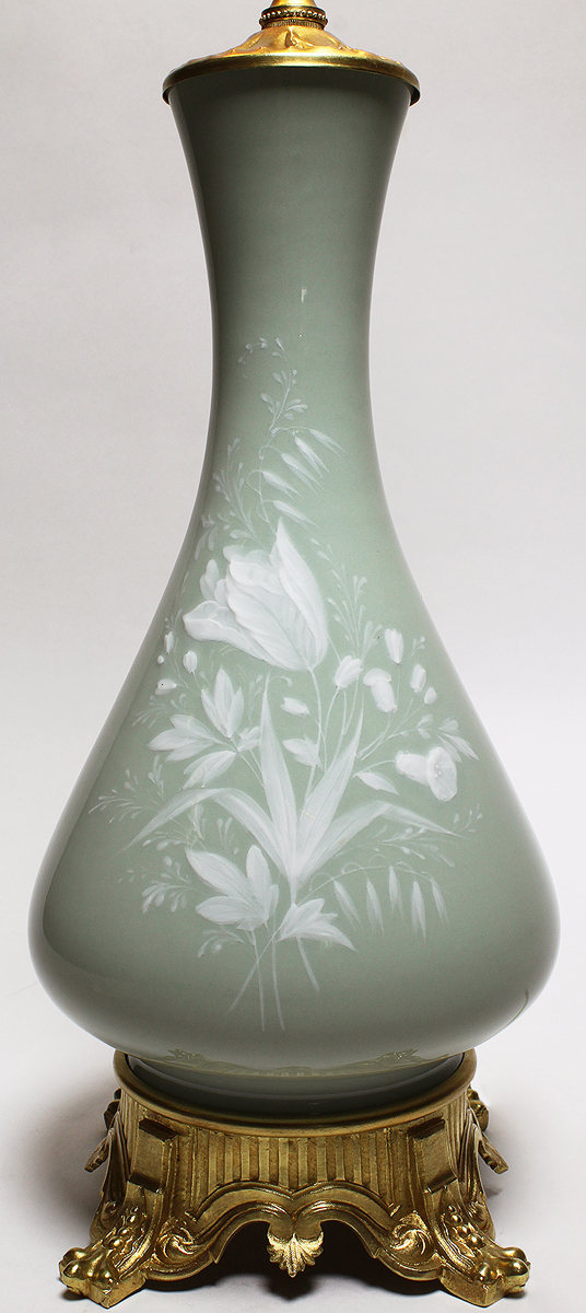 A Fine French 19th/20th Century Pâte-sur-Pâte Porcelain and Gilt-Bronze Mounted Ovoid-Shaped Table Lamp with a white low-relief floral design carved in slip and applied to a contrasting body over the blue-green porcelain. Circa: Paris, 1900.