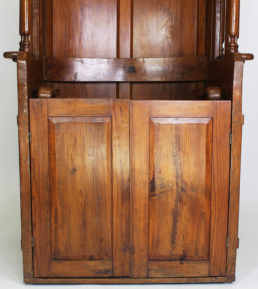 A Rare Italian 19th Century Carved Pine Catholic Church Confessional Stall - Booth. The Baroque revival body crowned with a carved and parcel gilt Papal insignia, the official decoration for the Pope in his capacity as the head of the Roman Catholic Church and sovereign of the Vatican City State, centered with a seat flanked by two open side window openings to hear the confessions of penitents and a pair of low front doors. Circa: 1890.