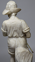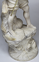A Charming Italian 19th-20th Century Carved Alabaster Figure of a Fisher Boy. The young boy wearing a blouse, with his suspender pant legs rolled up to his knees and a straw hat, standing barefoot on a Rocky Outcrop and holding a gilt metal fishing rod. Unsigned . Circa: 1900.