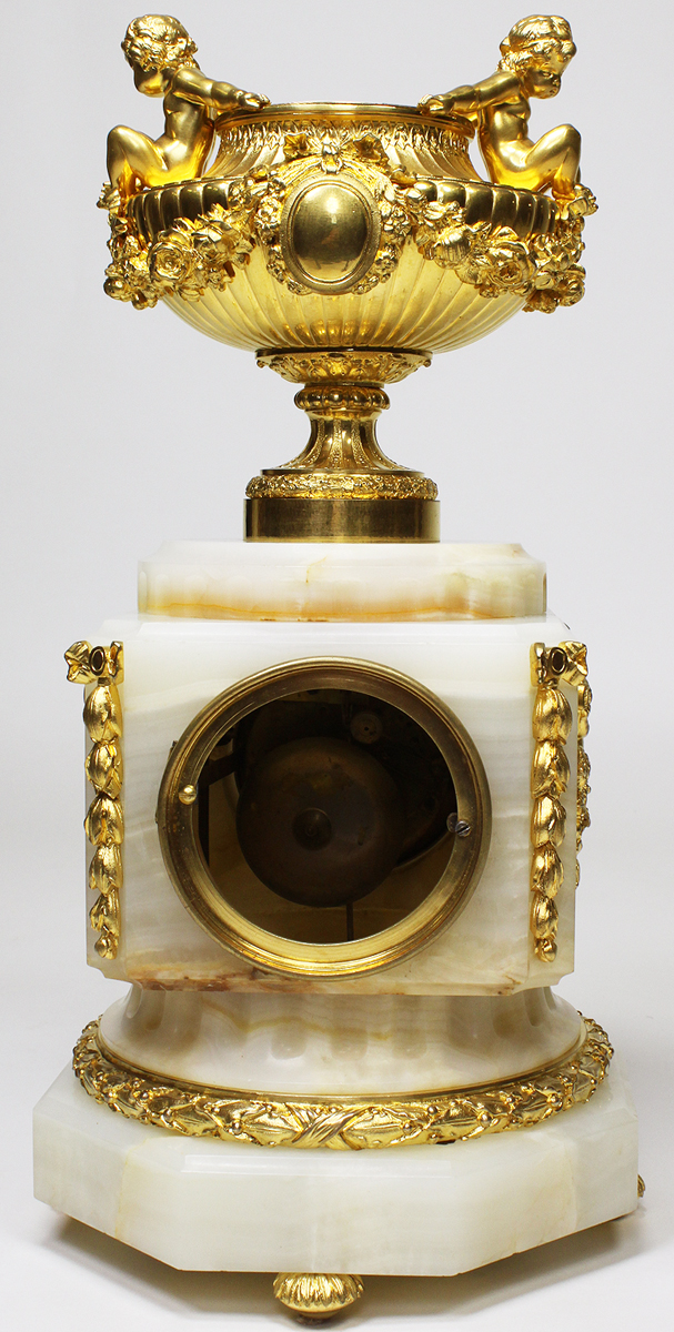 A Very Fine French 19th Century Louis XV Style Onyx and Ormolu Mounted Figural Mantel Clock. The edged and polished onyx body surmounted with a finely chased ormolu allegorical open-top urn flanked with figures of resting Putti (children) among wreaths and a shield. The circular porcelain enameled clock dial with Roman and Arabic numerals, signed "Delafontaine, Ft. de Bronzes, Paris" flanked by wreath-ends, the sides with plaques depicting allegorical figures of seated baby Bacchus' playing trumpets, all raised on acorn feet. Circa: Paris, 1890-1900.
