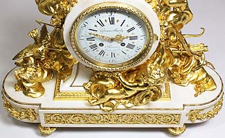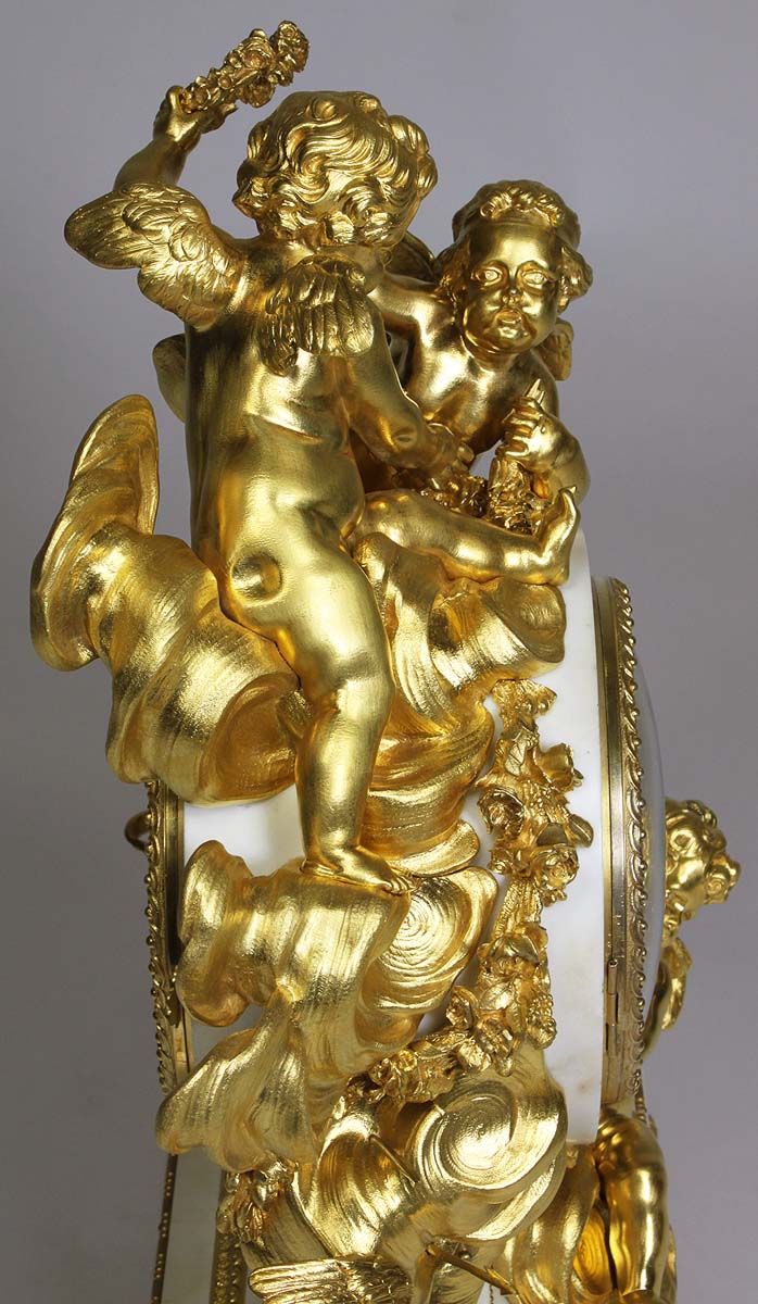 An Important and Palatial French Louis XV Style 19th Century Gilt-Bronze and White Marble Cherub Mantel Clock, attributed to Alfred-Emmanuel-Louis Beurdeley, the casting and gilding by Graux-Marly, Paris, the movement by P. Marti et Cie. The large and impressive marble and two-tone finely chased gilt-bronze (Ormolu) and white marble body, with its original superb quality mercury satin-gilt and burnished gilt (ciselé et doré au mat), surmounted by two reclining cherubs amongst clouds, one holding a triumphant floral wreath, the other a floral bouquet strand, flanked to each side by floral swags and attributes of Love, with kissing doves, on a shaped base with a further cloud-borne cherub, above a scrolling foliate frieze and garlands of flowers, with a bow, a quiver, trumpets and arrows protruding through within the clouds, raised on toupie feet. The beautifully decorated circular white enamel dial with gold fleur-de-lis' jewels, with Roman and Arabic numerals, signed "Graux Marly, Paris - Rue du Parc-Royal, 8". The bell striking movement stamped: "S. Marti et Cie. Médaille de Bronze". Circa: Paris, 1870's.