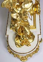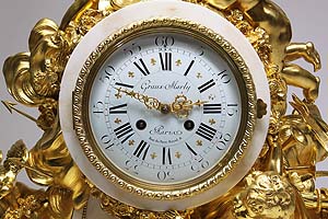 The model of this clock can be found in the Beurdeley sale in 1895, 6-9 May: Catalogue of Furniture and Works of Art made in the workshop and under the direction of M.A. Beurdeley, lot number 46, described as Pendule de style Louis XV, en marbre blanc, avec groupes d'amours dans le goût de Boucher, tenant des guirlandes de fleurs en bronze ciselé et doré au mat. Le socle en marbre blanc est enrichi de rinceaux et de guirlandes en bronze doré Haut. 68 cent. Larg. 68 cent. It was acquired by M. Martin Fuld for 1600 francs or.