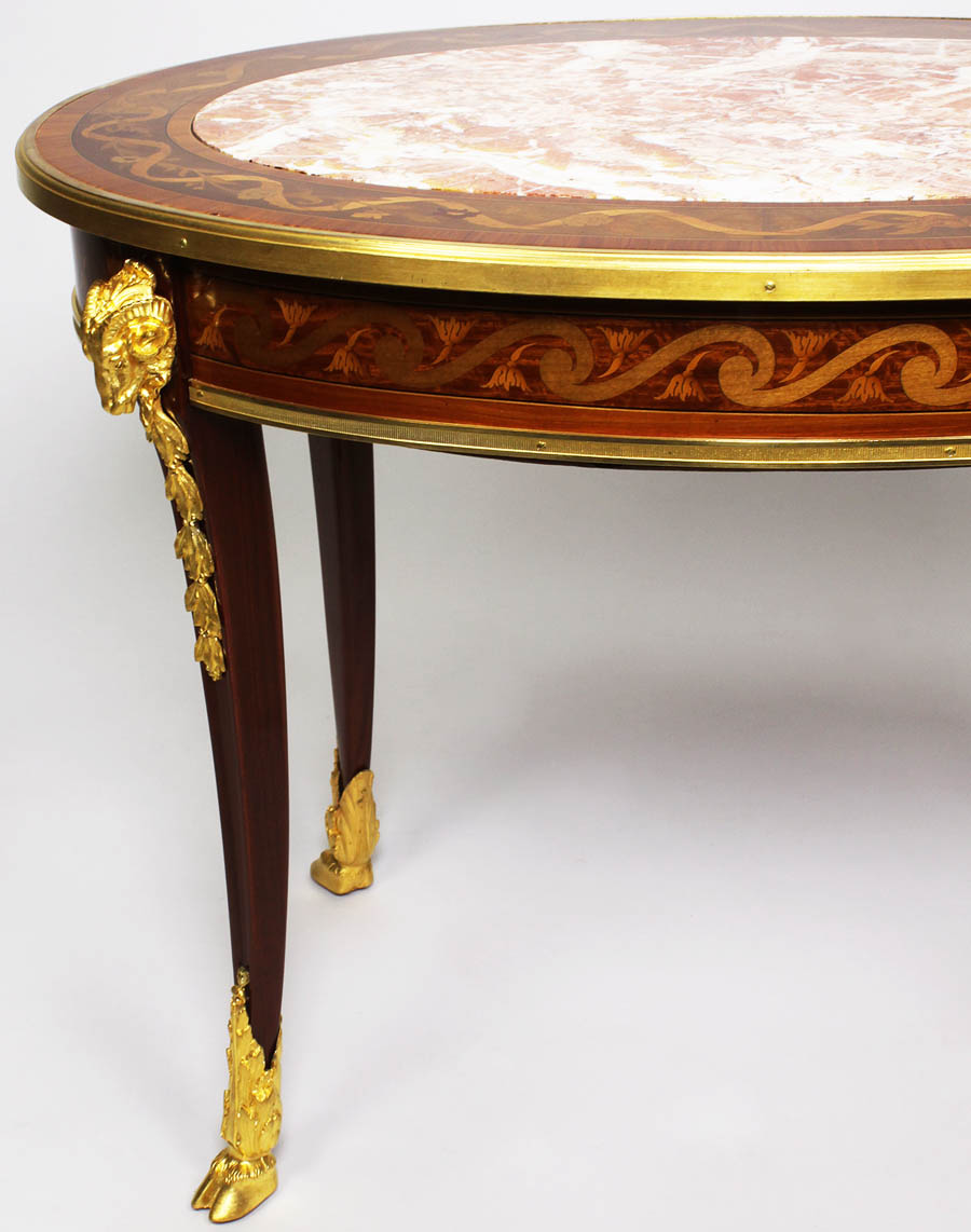 A Very Fine French Louis XV Style Belle Époque Figural Ormolu Mounted Mahogany, Tulipwood and Fruitwood Marquetry Oval Coffee Table with Marble Top, in the manner of François Linke (1855-1946). The low table with a finely inlaid border top and apron in the form of waved scrolls with flowers framed with an ormolu trim, centered with a fitted Rouge Royal marble top inset, mounted on each corner with allegorical ormolu ram-head masks above floral mounts, all raised on four cabriolet legs ending on hoofed ormolu feet. Circa: Paris, 1900.