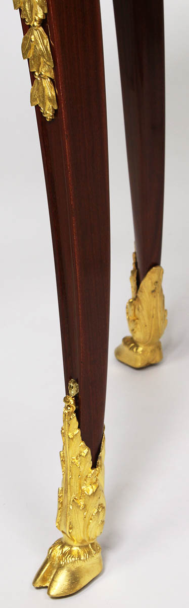 A Very Fine French Louis XV Style Belle Époque Figural Ormolu Mounted Mahogany, Tulipwood and Fruitwood Marquetry Oval Coffee Table with Marble Top, in the manner of François Linke (1855-1946). The low table with a finely inlaid border top and apron in the form of waved scrolls with flowers framed with an ormolu trim, centered with a fitted Rouge Royal marble top inset, mounted on each corner with allegorical ormolu ram-head masks above floral mounts, all raised on four cabriolet legs ending on hoofed ormolu feet. Circa: Paris, 1900.