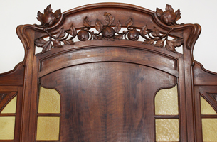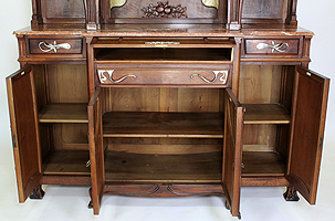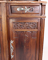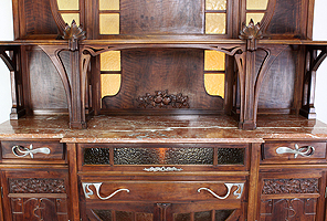 A Fine and Large Italian 19th-20th Century Art Nouveau Carved Walnut Credenza Buffet Server by Vittorio Valabrega (1861-1952). The tall finely carved walnut body with twin center doors carved with grape vines, fitted with molded yellow-craft-glass panels above an apron drawer and a tilt-door compartment with glass paneling, flanked by single doors with similar carvings below a drawer, all with silver-plated hardware in the form of scrolled branches with leaves; the upper section with a center shelf, glass panels and carvings of flowers, leaves and fruits, fitted with a veined Rivera brown marble top. Circa: Turin, Italy 1900.
