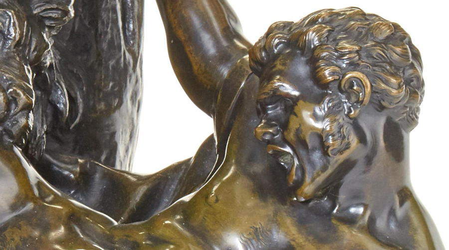 A Very Fine French 19th Century Patinated Bronze Figure of "Milo of Croton and the Lion" after the marble sculpture of Milon de Crotone by renown French sculptor Étienne Maurice Falconet (1 December 1716 – 24 January 1791) currently at the Louvre Museum in Paris, France and another example in bronze at the Hermitage Museum in Saint Petersburg, Russia. The finely executed bronze sculpture depicting the 6th-Century BC wrestler, from the Magna Graecian City of Croton, as a nude and muscular male wrestler, resting on his back, holding on to a tree trunk as he fights off an attack by a lion who is biting him on the leg, in a brown patina and raised on a green marble plinth. Incised: Falconet. Circa: Paris, 1870-1880.