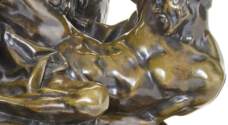 A Very Fine French 19th Century Patinated Bronze Figure of "Milo of Croton and the Lion" after the marble sculpture of Milon de Crotone by renown French sculptor Étienne Maurice Falconet (1 December 1716 – 24 January 1791) currently at the Louvre Museum in Paris, France and another example in bronze at the Hermitage Museum in Saint Petersburg, Russia. The finely executed bronze sculpture depicting the 6th-Century BC wrestler, from the Magna Graecian City of Croton, as a nude and muscular male wrestler, resting on his back, holding on to a tree trunk as he fights off an attack by a lion who is biting him on the leg, in a brown patina and raised on a green marble plinth. Incised: Falconet. Circa: Paris, 1870-1880.