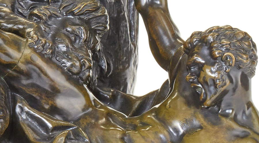 A Very Fine French 19th Century Patinated Bronze Figure of "Milo of Croton and the Lion" after the marble sculpture of Milon de Crotone by renown French sculptor Étienne Maurice Falconet (1 December 1716 – 24 January 1791) currently at the Louvre Museum in Paris, France and another example in bronze at the Hermitage Museum in Saint Petersburg, Russia. The finely executed bronze sculpture depicting the 6th-Century BC wrestler, from the Magna Graecian City of Croton, as a nude and muscular male wrestler, resting on his back, holding on to a tree trunk as he fights off an attack by a lion who is biting him on the leg, in a brown patina and raised on a green marble plinth. Incised: Falconet. Circa: Paris, 1870-1880.